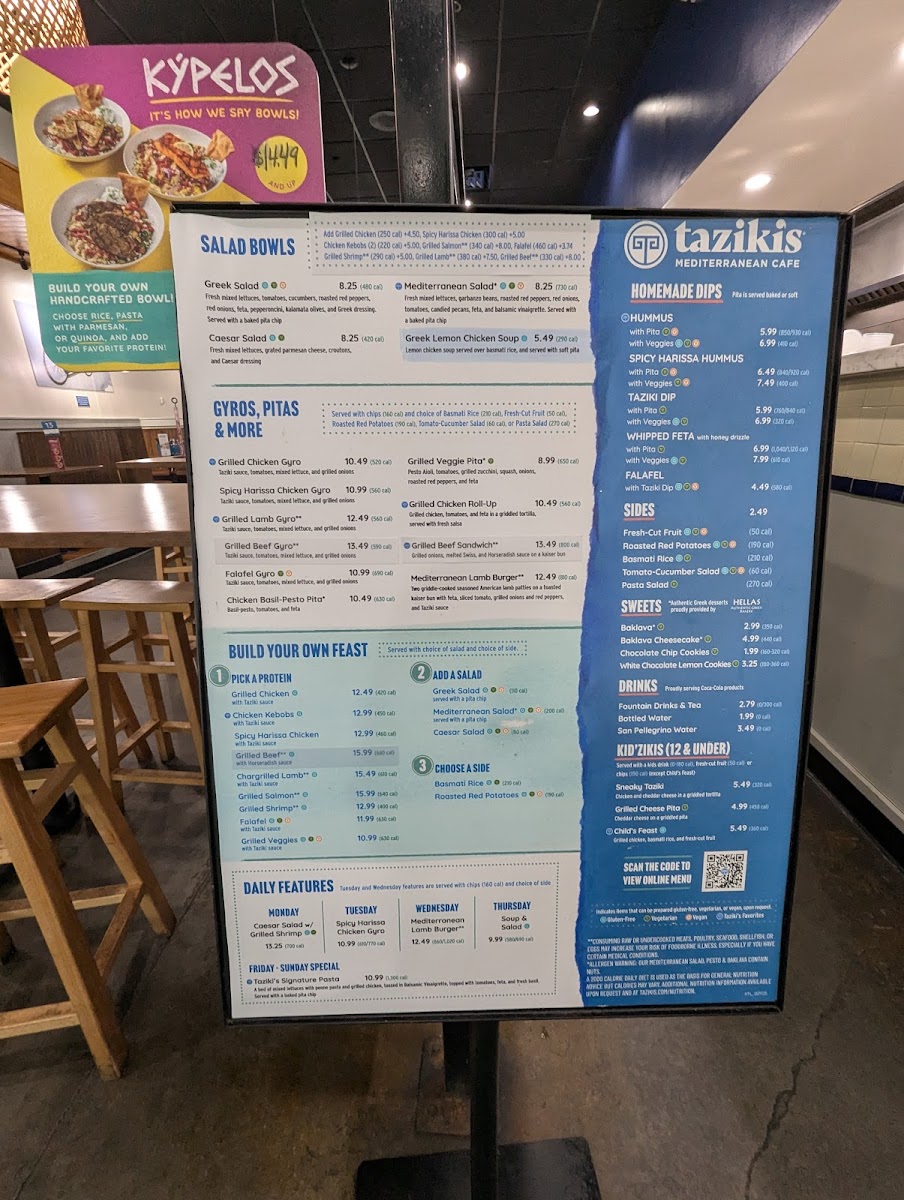 Baked Falafels on fresh mixed lettuce, tomatoes, cucumbers, roasted red peppers, red onions, feta, pepperoncini, kalamata olives, and Greek dressing. Served with Taziki sauce, and a baked pita chip.